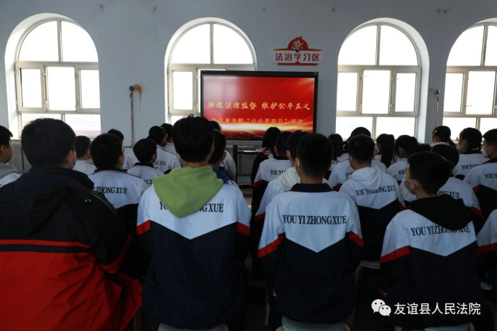 2月24日,友谊县人民法院邀请友谊县第一中学学生参加法院“云端开放日”活动,通过观看精心录制的讲解视频,让同学们不用走出校园就可以“云游”法院,感受法治氛围。