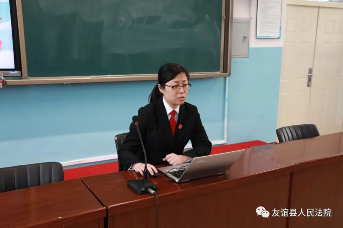 3月9日下午,友谊县人民法院党组成员、副院人选王宇欣走进友谊县第二中学,为学生们讲授开学第一堂法治课,在学生们纯真的心灵中点亮一盏法治“明灯”。
