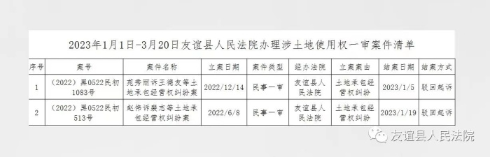 第四条[公开要求] 本院将以每季度或根据案件审结数量以月为单位,汇总涉土地争议一审案件的审结情况,通过“友谊县人民法院网”向社会公开案件审判信息情况。