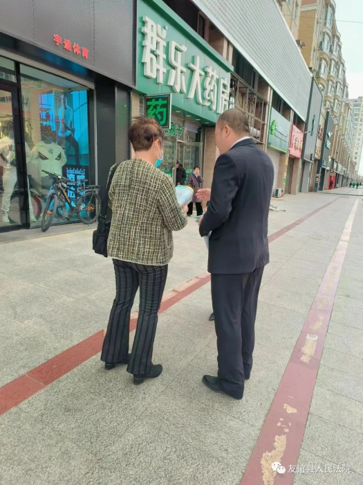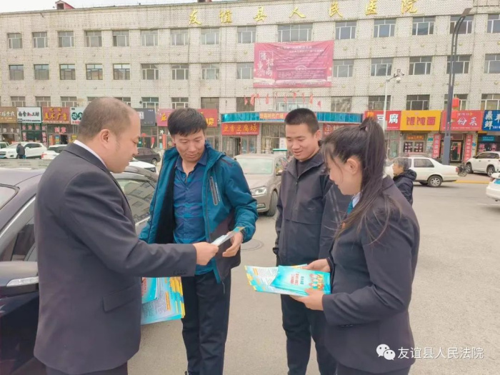 2023年4月27日,友谊县人民法院干警向社会群众和部分商家分发宣传手册和宣传单,向广大人民群众宣传法治理念,着重宣传劳动者所享有的合法权益以及维权典型案例等,同时还在现场为群众解读法律法规,解答劳动纠纷、劳务纠纷等群众容易混淆的法律概念。活动共计分发宣传手册50余份,深入10多家商家店铺,接受群众法律咨询30余人。