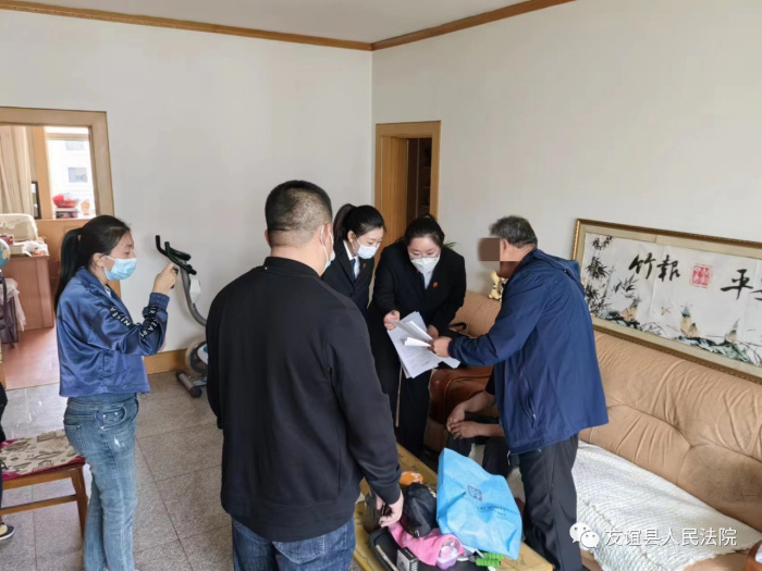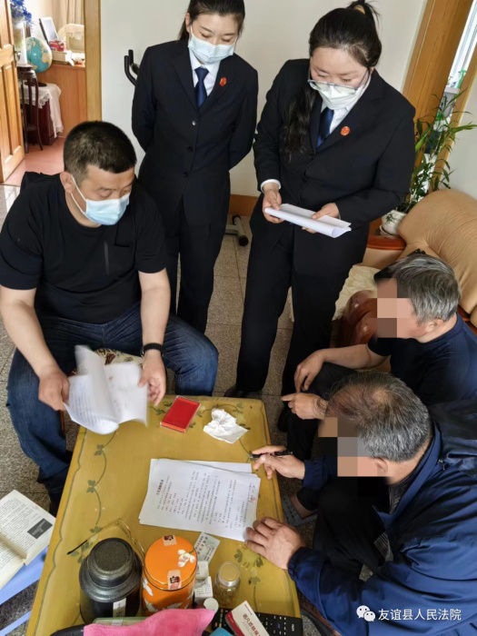 6月1日,友谊县人民法院工作人员主动到一户民宅内提供上门司法服务,为行动不便的当事人进行现场调解。