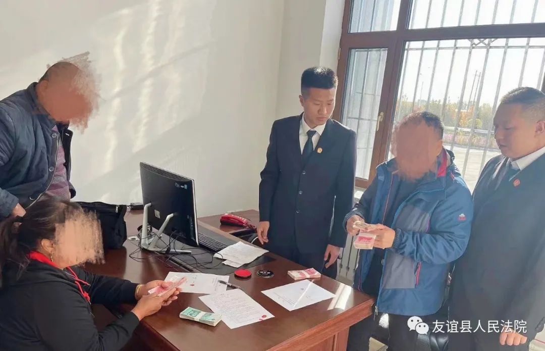 基本案情:黄某某与郭某某房屋买卖合同纠纷一案,本案经我院依法调解后,郭某某并未在调解期限内给付剩余购房款3万元,故黄某某于2023年10月7日依法申请执行,得益于友谊法院“执前调解”工作机制,立案庭在收到当事人的执行申请后及时向执行局反馈,执行局立即对案情进行分析,考虑到本案标的额不大,我院执行局拨通了郭某某的电话,提前介入纠纷,督促被告履行生效法律文书确定的义务,分析逾期履行的利弊,最终,郭某某带着3万元现金在我院执行局工作人员的见证下一次性给付黄某某,双方均表示对这个处理结果非常满意。至此,从收到立案申请到履行完毕一共为期4天,高效、实质地解决了纠纷。