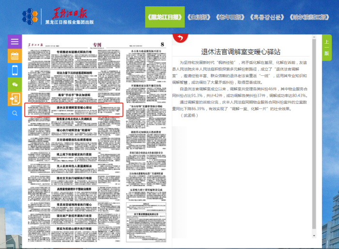 【媒体聚焦】《黑龙江日报》刊发:退休法官调解室变暖心驿站