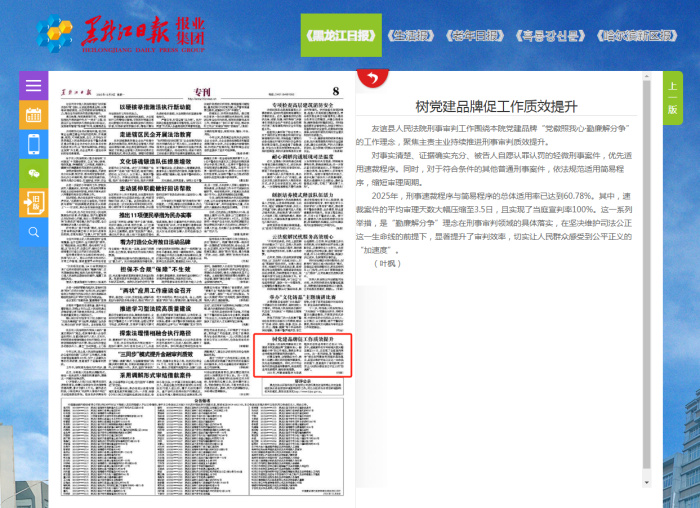 12月8日,《黑龙江日报》报道友谊县人民法院“树党建品牌促工作质效提升”。
