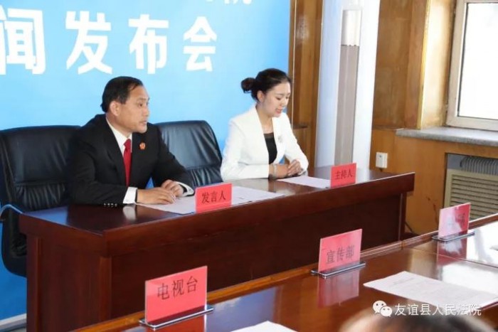 近日,友谊县人民法院召开新闻发布会。向新闻媒体及社会各界通报该院审判工作情况。县委宣传部工作人员主持会议,友谊法院党组成员、副院长孙国峰进行新闻发布。
