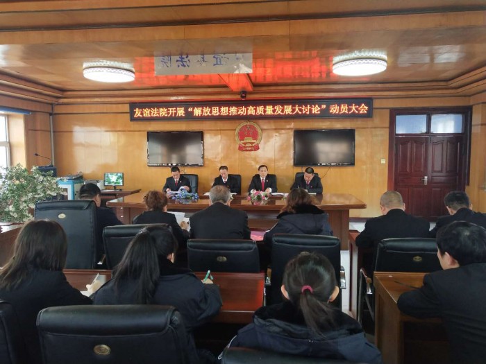 1月29日,友谊法院按照市中院和县委的要求,召开解放思想推动高质量发展大讨论动员大会,友谊法院全体干警参加了会议。这次动员大会,目的是深入学习贯彻习近平总书记在深入推进东北振兴座谈会上的重要讲话和考察黑龙江时的重要指示精神,在全院党员干部中开展解放思想推动高质量发展大讨论,切实以思想的大解放引领法院各项审执工作有效开展,为友谊全面发展提供有力的司法保障和良好的法治环境。
