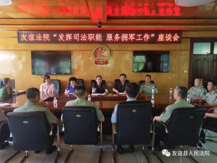 8月1日上午,友谊法院开展以“发挥司法职能 服务拥军工作”为主题的座谈会,热烈庆祝中国人民解放军建军92周年。特邀请县委常委、人民武装部政委史洪宇及官兵们参加座谈会,友谊法院党组书记、院长袁春友主持。