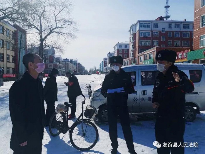 3月9日上午,友谊县人民法院党组书记、院长袁春友到干警值守的卡口督察疫情防控工作,并慰问值勤干警们,为他们送去关心和问候。