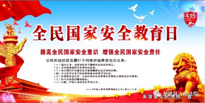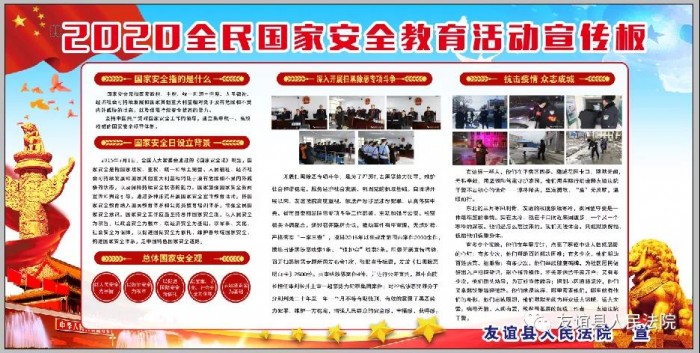 2020年4月15日是第五个全民国家安全教育日,为贯彻落实总体国家安全观,切实增强全民国家安全法治意识,4月15日上午,友谊法院组织开展国家安全教育日普法宣传活动。