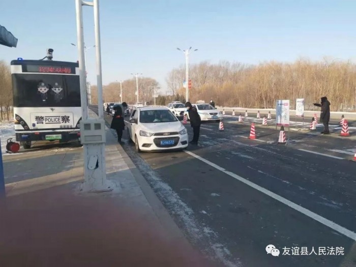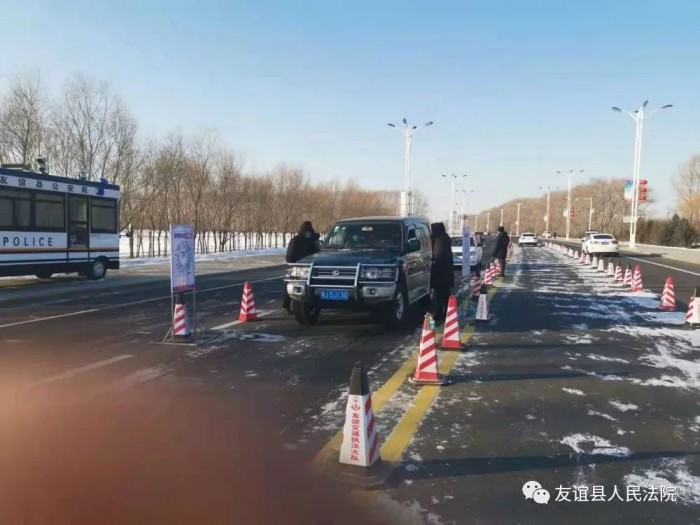 1月31日,友谊法院严格落实县防控领导小组相关工作要求,组织干警负责卡口点执勤,24小时全天坚守岗位、车辆管控工作,做到“车辆检查100%,人员检查100%”。该卡口为进入县城的主要入口,车流量大,风险系数较高,按照院里的工作安排,24小时全体干警分组轮流执勤。